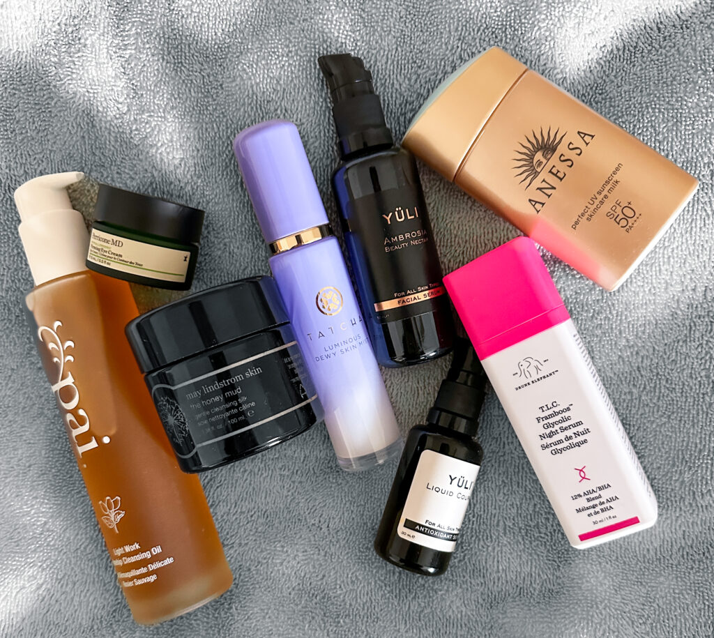 Then I get ready to go about my day. Most of the time I’m trying to beat traffic into the city, or on my way to the South Bay, so my morning skincare routine isn’t too many steps. Usually a splash of water, or a light cleanse with something gentle like YÜLI’s Halcyon Cleanser, or Jan Marini’s C-Esta Cleansing Gel gets my face refreshed and ready. I love a good moisturizer, and currently it’s been Alpyn Beauty’s PlantGenius Melt Moisturizer. I first tried their products at a Credo-EWG summit, and loved their creams. This one is pretty new, and I just love how my skin feels throughout the day. I might do an eye product to look more ‘awake’ if I have time, and I find that creams work better for me. I’m currently using Dr. Perricone’s Hypoallergenic Firming Eye Cream, which is nicely rich, and doesn’t irritate my eyes. Finally, I always put a sunblock on my face to protect it from the elements, such as EltaMD UV Physical Broad-Spectrum SPF 41 Tinted. Lately, I’ve been trying Asian sunscreens like Shiseido Japan’s Anessa SPF50 for when I want something lighter, and not mineral sunblock based. Those Asian sun filters are just best in the world right now!